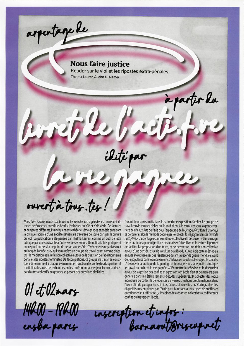 Du 01 mars 2022 au 02 mars 2022, on était aux Beaux-arts de Paris (Paris) pour l’ arpentage de Nous faire justice à partir du livret de l’acti·f·ve du collectif la vie gagnée.