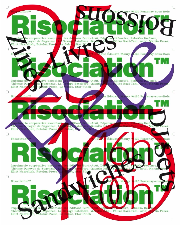Avec : l’équipe de Risociation (Dépense défensive, Rebekka Deubner, Thomas Dunoyer de Segonzac, La Grange Batelière, Quentin Juhel, Félixe Kazi-Tani, Ariel Martín Pérez, Eliot Nasrallah, Rotolux Press, Le Sabot, Star Finch).