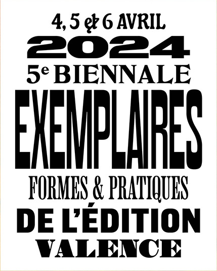 La cinquième biennale Exemplaires – Formes et pratiques de l’édition regroupe neuf écoles d’art et de design francophones. Elle est accueillie et coordonnée par l’équipe enseignante en design graphique de l’ÉSAD •Valence, Lisa Bayle, Alexis Chazard, Marie Gaspar, Tom Henni, Cédric Rossignol-Brunet, Gilles Rouffineau, Adrien Vasquez et Samuel Vermeil. Exemplaires 2024 est organisée par le comité de pilotage de l’événement constitué d’enseignant·es de l’Ensba (Lyon), l’EESAB (Rennes), la HEAR (Strasbourg), l’isdaT (Toulouse) et l’ÉSAD (Valence) avec la participation de La Cambre (Bruxelles), la HEAD (Genève), l’ESADHaR (Le Havre) et l’ÉSAL (Metz). Cette manifestation regroupant les étudiant·es et les enseignant·es d’écoles d’art, répond à un intérêt affirmé pour les pratiques éditoriales dans le champ contemporain du design graphique et de l’art. La biennale prend la forme de sélections collectives d’ouvrages, de publications issues de ces sélections, d’un colloque et d’exposition s. Chaque atelier constitué par les écoles participantes forme une sélection d’objets éditoriaux francophones, publiés ces cinq dernières années et choisis selon des critères et une thématique définis librement. D’autres ouvrages sont présents à titre de comparaison (plus anciens, dans d’autres langues, etc). Chacune des sélections est accompagnée d’une édition réalisée par les étudiant·es, produite en 300 exemplaires et diffusée gratuitement pendant la biennale afin d’éclairer les choix et partis pris de l’atelier. La notion d’exemplarité ne se limite pas à l’appréciation graphique des ouvrages sélectionnés, elle s’intéresse aux procédés d’élaboration, à la singularité de mise en œuvre, à la cohérence entre forme et contenu et aux conditions économiques de production des projets éditoriaux. L’exposition des sélections rassemble les ouvrages analysés par les différents groupes de travail et les éventuels ouvrages dits de comparaison en un lieu unique, aux Clévos à Étoile-sur-Rhône. Une exposition intitulée Archéologies numériques présentée en deux volets : Meilleurs souvenirs de CD-Rom et Dead Medias Forensics (DMF.re) a lieu à l’ÉSAD •Valence du 28 mars au 5 avril sur rendez-vous. En parallèle de la tenue d’exposition s et de la restitution des ateliers de sélection de la biennale, se tient un colloque international réparti en trois demi-journées thématiques. Trois groupes de conférences, rythmés par des tables rondes, se construisent en écho aux enjeux éditoriaux soulevés par les ateliers de chaque école. Organisée en 2024 en milieu rural par une école de plus petite dimension que ses consœurs, cette édition de la biennale Exemplaires fera pour la première fois l’objet d’une diffusion en direct participative afin de permettre au plus grand nombre de suivre l’événement, la logistique et le lieu d’accueil de la biennale ne pouvant recevoir qu’un public limité. À l’issue des trois journées de colloque, les conférences seront librement consultables en ligne sur le site web d’Exemplaires 2024 et hébergées par la plateforme CanalU.
