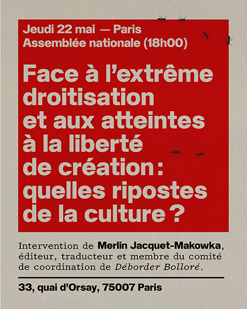 Le mercredi 21 mai 2025, se tenait à l’Assemblée nationale (Paris) la table ronde : « Face à l’extrême droitisation et aux atteintes à la liberté de création : quelles ripostes de la culture ? » dans laquelle a été présenté Déborder Bolloré. Un événement auquel nous n’étions pas présent·es physiquement.