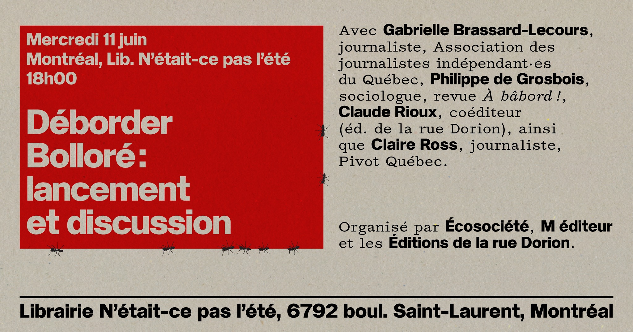 Le mardi 10 juin 2025, se tenait à la Librairie N’était-ce pas l’été (Montréal) un lancement de Déborder Bolloré. Un événement auquel nous n’étions pas présent·es physiquement.