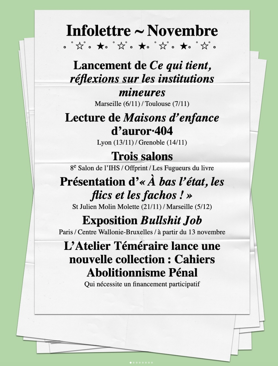 Le vendredi 06 novembre 2026, se tenait à la librairie L’Hydre aux mille têtes (Marseille) le Lancement de Ce qui tient, réflexions sur les institutions mineures. Un événement auquel nous n’étions pas présent·es physiquement.