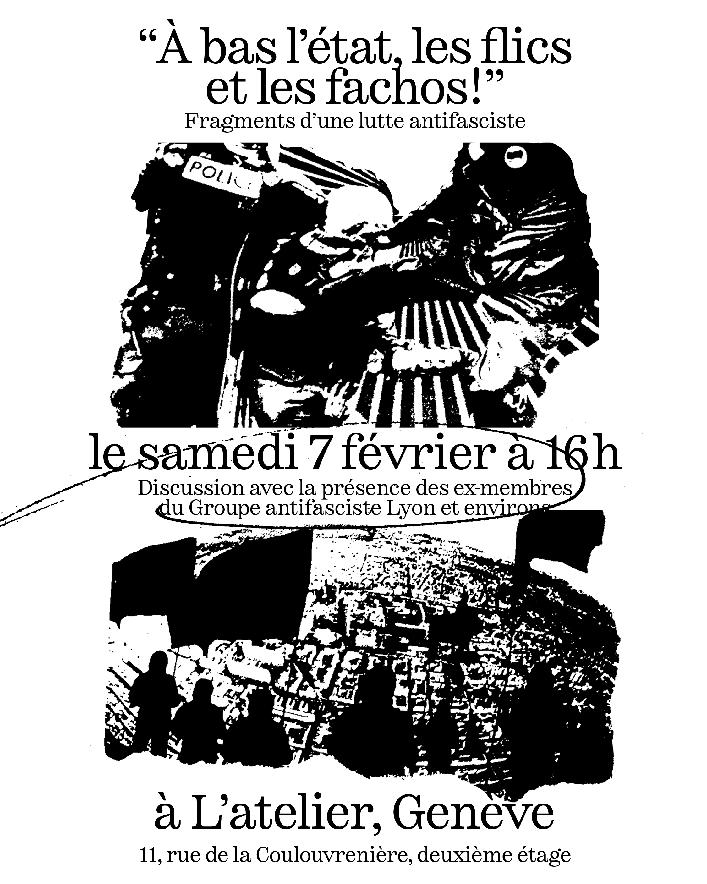 Le samedi 07 février 2026, se tenait à L’atelier à l’Usine (Genève) la Présentation d’ « À bas l’état, les flics et les fachos ! ». Un événement auquel nous n’étions pas présent·es physiquement.