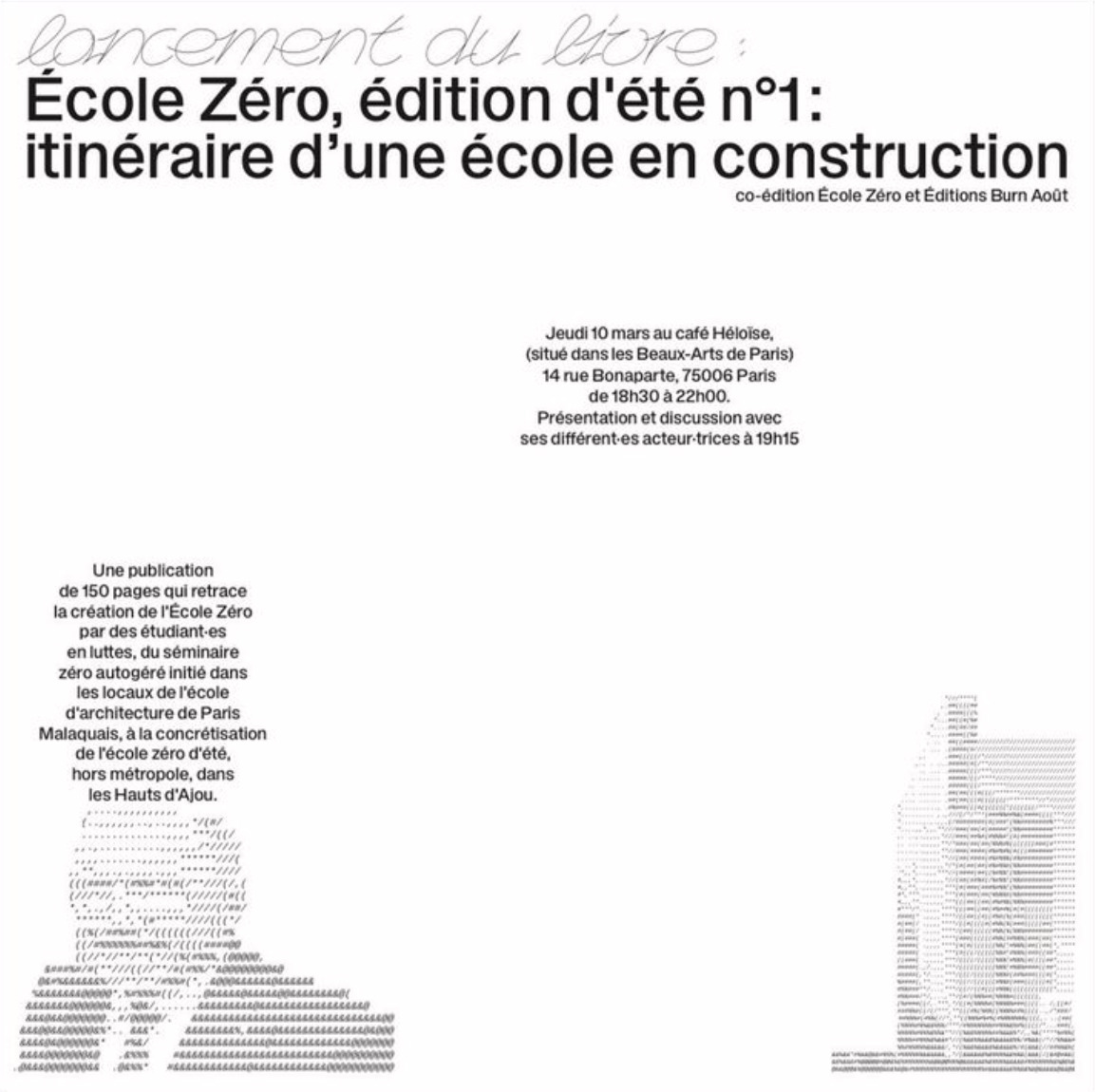 Le jeudi 10 mars 2022, on était aux Beaux-arts de Paris (Paris) pour le lancement d’École 0, édition d’été, itinéraire d’une école en construction.