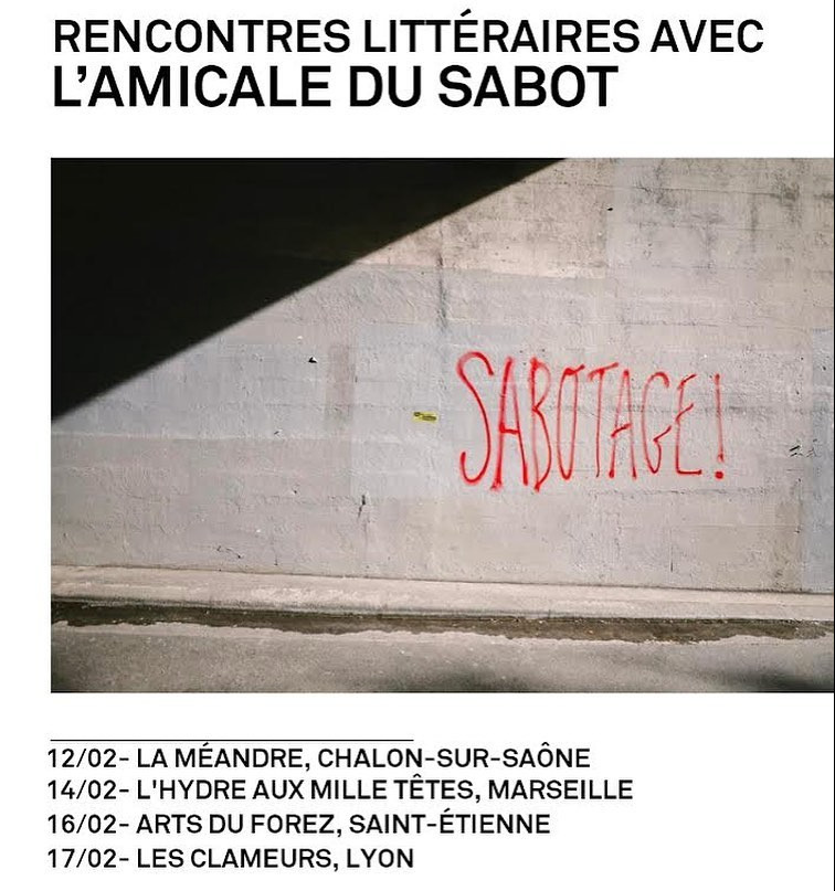 « Construite autour d’une revue éponyme, née en 2017 et dédiée au sabotage littéraire et artistique, Le Sabot est une amicale dotée d’une maison d’édition (ou vice versa). Joyeuse insolente, elle publie moultes formes pour : intervenir sur le monde et le dire sans passivité. » Lectures, présentation des livres et rencontre avec les auteur.ice.s de l’amicale.