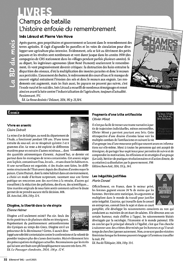 Il n’est pas facile de tresser une trame narrative à partir de trajectoires individuelles, mêmes entremêlées. Olivier Minot y parvient pourtant avec brio. Cette rétrospective d’une dizaine d’années laisse voir les multiples combats de l’antifascisme en suivant la vie d’un groupe issu d’une mouvance politique souvent avare en informations sur elle-même. Merci à toutes les personnes qui ont accepté de témoigner, de partager leur expérience pour permettre de suivre et de comprendre les motivations, les réflexions et les stratégies d’un groupe (La Gale), héritier de pratiques révolutionnaires et d’action directe, de sa création à sa dissolution par le gouvernement. PM