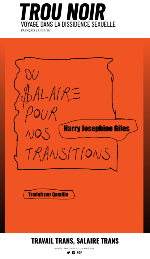 Initialement publié sous la forme d’un fanzine en 2019, Du salaire pour nos transitions est un manifeste transféministe qui pense les conditions d’émancipation révolutionnaires des personnes trans au sein du système capitaliste qui nous traverse. Il a été traduit en français par Qamille, traductrice et militante faisant partie du collectif de traduction et d’auto-support TRANSGRRRLS, et a été publié aux éditions Burn~Août en avril 2023.