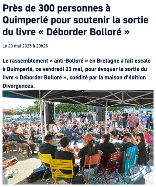 Le rassemblement « anti-Bolloré » en Bretagne a fait escale à Quimperlé, ce vendredi 23 mai, pour évoquer la sortie du livre Déborder Bolloré, coédité par la maison d’édition Divergences.