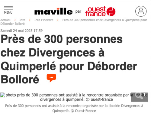 Près de 300 personnes ont assisté ce vendredi 23 mai 2025 en soirée, à la présentation du recueil Déborder Bolloré, à la librairie Divergences de Quimperlé (Finistère).