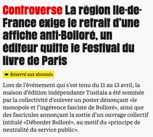 Lors de l’événement qui s’est tenu du 11 au 13 avril, la maison d’édition indépendante Tusitala a été sommée par la collectivité d’enlever un poster dénonçant « le monopole et l’ingérence fasciste de Bolloré », ainsi que des fascicules annonçant la sortie d’un ouvrage collectif intitulé Déborder Bolloré, au motif du « principe de neutralité du service public ».