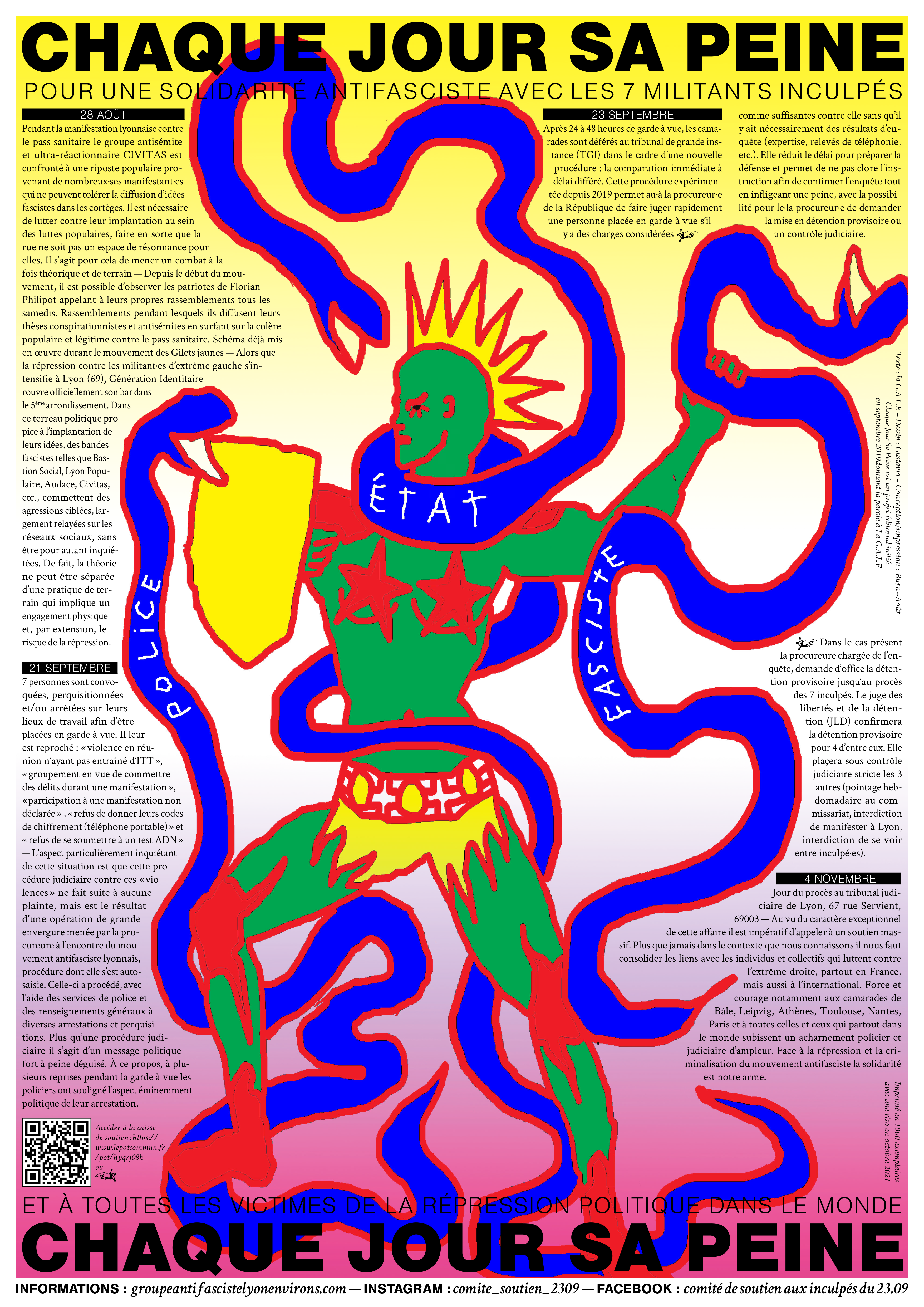 À la suite d’une bagarre survenue au cours d’une manifestation anti-pass lors de l’été 2021, sept militants antifascistes lyonnais ont été accusés de violences en réunion. En publiant cette affiche, dans le cadre du projet « Chaque jour sa peine » entrepris un an plus tôt avec la GALE, nous apportons notre soutien aux inculpés. L’affiche a été imprimée en 2 000 exemplaires et puis donnée à différents réseaux antifascistes pour qu’ils la distribuent de leur côté.