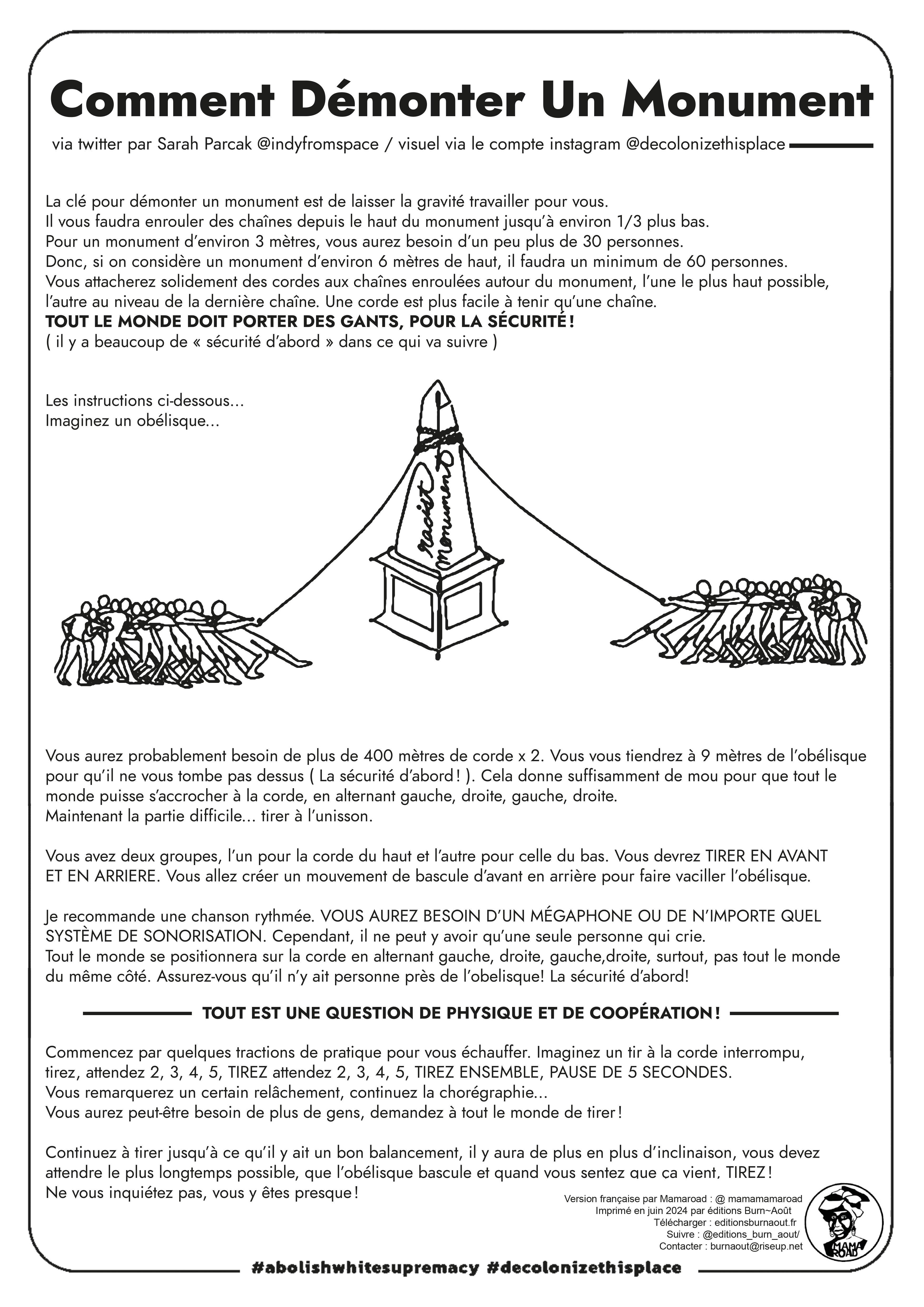 Comment démonter un monument est la version française de How To Take Down A Monument, l’affiche-tutoriel de Decolonize this place et Sarah Parcak, publiée aux États-Unis en juin 2020. Traduit par le collectif strasbourgeois Mamaroad en 2022, cette affiche rappelle non seulement l’urgence d’apporter une réflexion critique sur l’héritage colonialiste qui persiste dans le paysage urbain, mais aussi de s’en défaire, et cela par nos propres moyens. Plus qu’une affiche-tutoriel, il s’agit-là d’un appel à l’action directe contre les formes de domination et de racisme ancrées dans notre patrimoine.