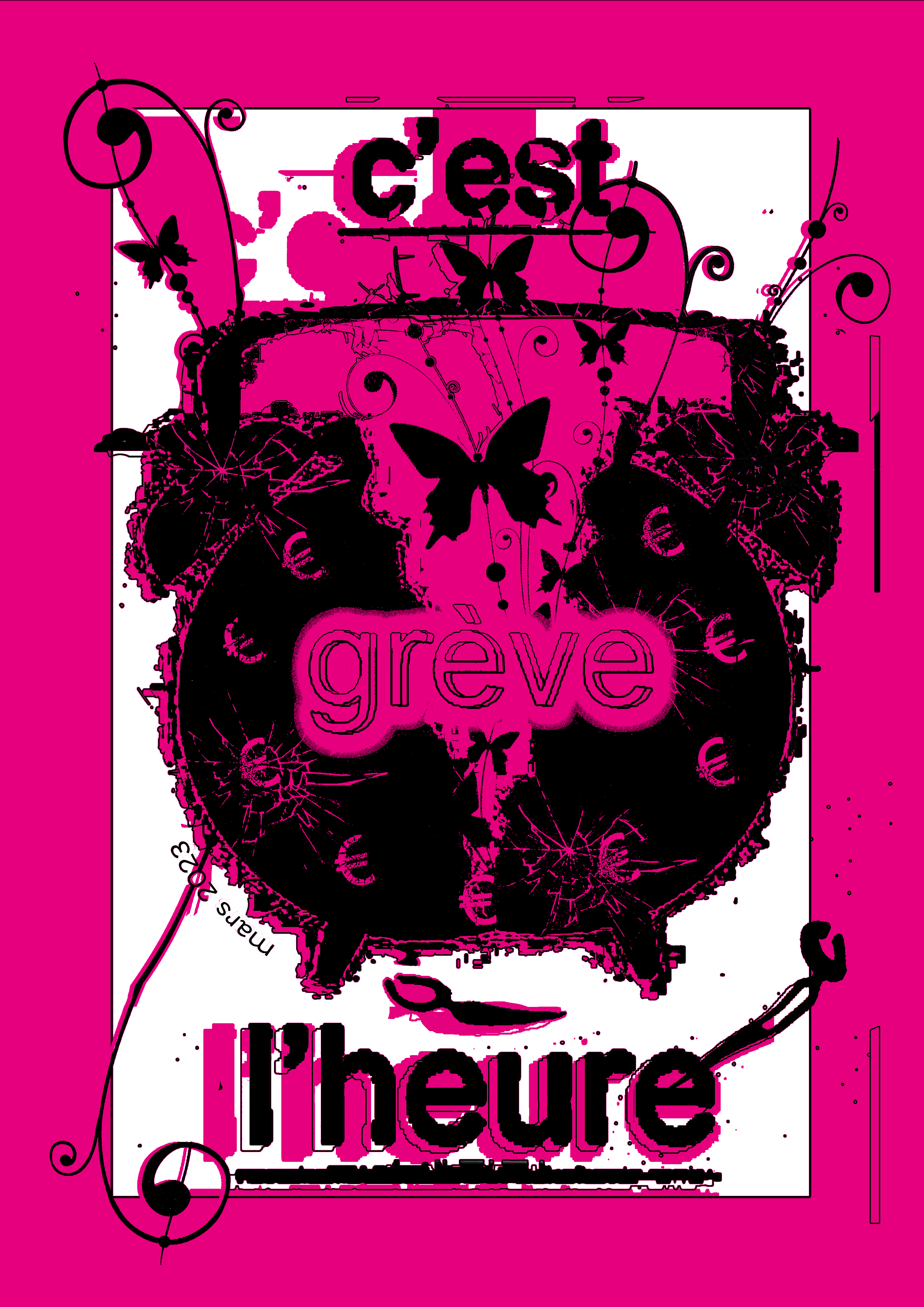 Affiche réalisée par Ethan Assouline dans le contexte du mouvement social contre la réforme des retraites de 2023 portée par Élisabeth Borne et Emmanuel Macron. Les bénéfices des ventes sont reversés à la Caisse de solidarité contre la répression Paris – IDF. Il s’agit d’une caisse de soutien de la coordination anti-répression Paris Île-de-France qui se propose d’organiser collectivement le soutien aux personnes victimes de la répression notamment dans les manifestations, les quartiers populaires ou les réfugié·es.
