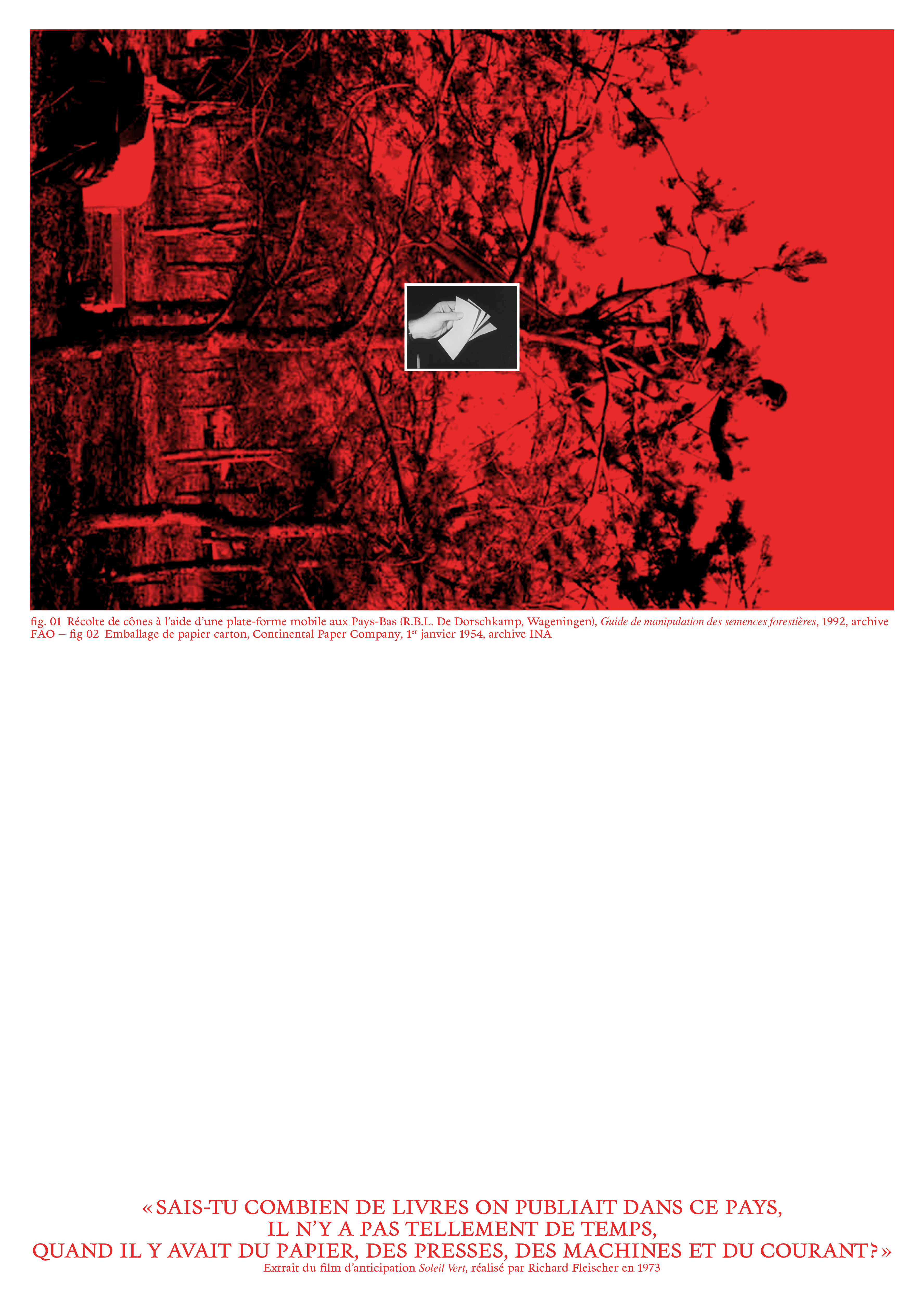 Cette affiche réalisée par Jim Fontana est issue du tract de la collection « Positions d’éditeurices » Au commencement – vers une écologie du livre de papier. Dans lequel Lalie Thébault Maviel explore l’impact écologique et social de l’industrie papetière. De la pâte à papier importée aux plantations industrielles d’eucalyptus, elle dévoile les coulisses de cette filière. Entre recyclage, labels durables et écoconception, l’autrice propose des pistes concrètes pour penser une édition plus responsable, de la fabrication à la diffusion. Un guide indispensable pour repenser notre pratique de l’édition et notre relation au papier et aux forêts.