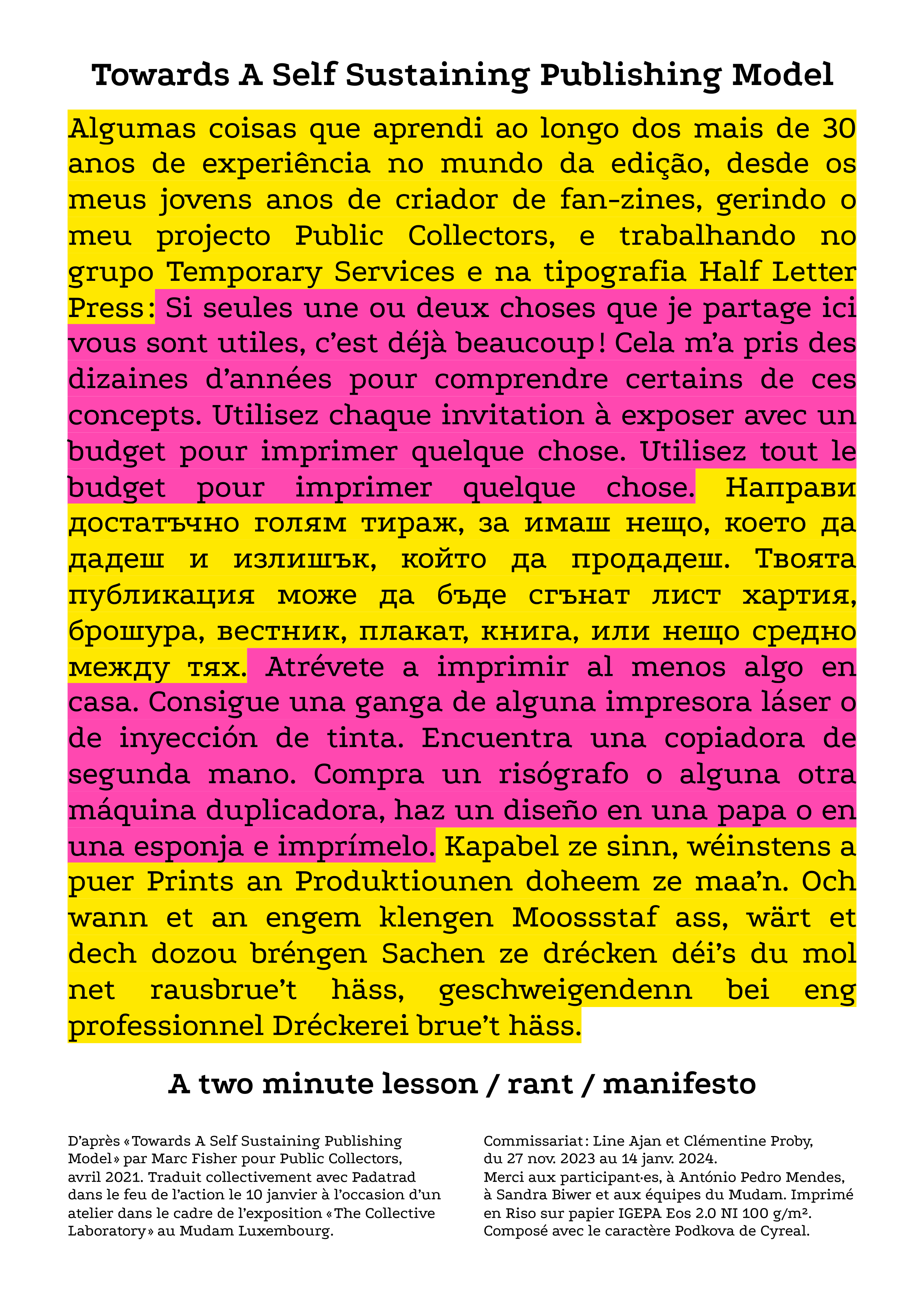 D’après Towards A Self Sustaining Publishing Model par Marc Fisher pour Public Collectors, avril 2021. Traduit collectivement avec Padatrad dans le feu de l’action le 10 janvier 2024 à l’occasion d’un atelier dans le cadre de l’exposition The Collective Laboratory au Mudam Luxembourg. Commissariat : Line Ajan et Clémentine Proby, du 27 novembre 2023 au 14 janvier 2024. Merci aux participant·es, à António Pedro Mendes, à Sandra Biwer et aux équipes du Mudam.